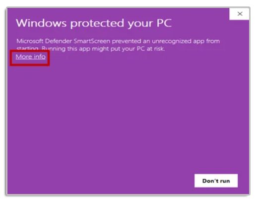 หากปรากฏข้อความแจ้งเตือนเกี่ยวกับความปลอดภัยของ Windows โดยระบุว่าโปรแกรมมาจากผู้พัฒนาที่ Microsoft ไม่รู้จักให้กด More Info