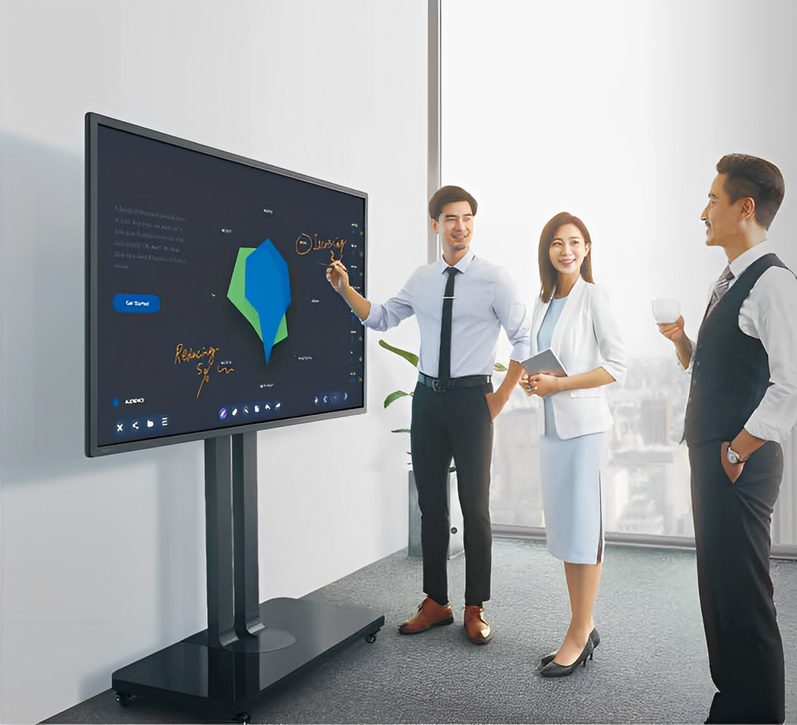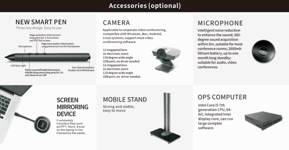The unique cloud conferencingsystem supports screen sharing with mobile phone, tablet, computer, and interactive flat panel without space Itcan realize real-time, smooth, face-to-face communication, sharing and collaboration through two-way touch screen.